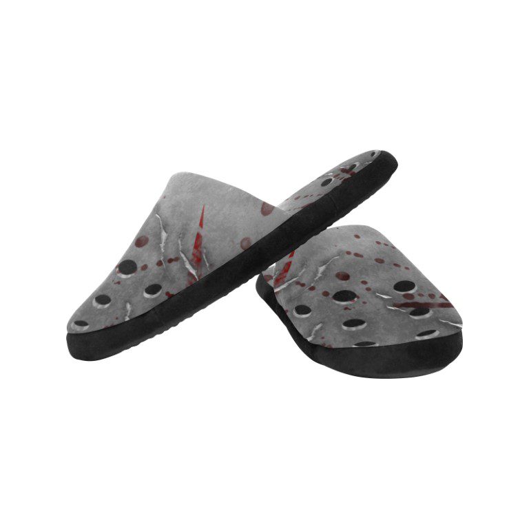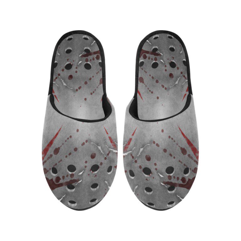 These plush slippers with a distressed and bloody hockey mask design are inspired by your favorite horror movie monsters.